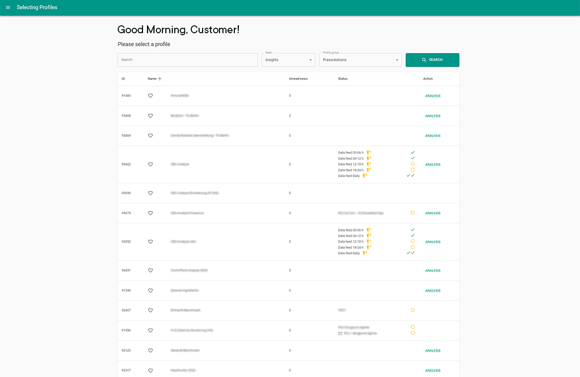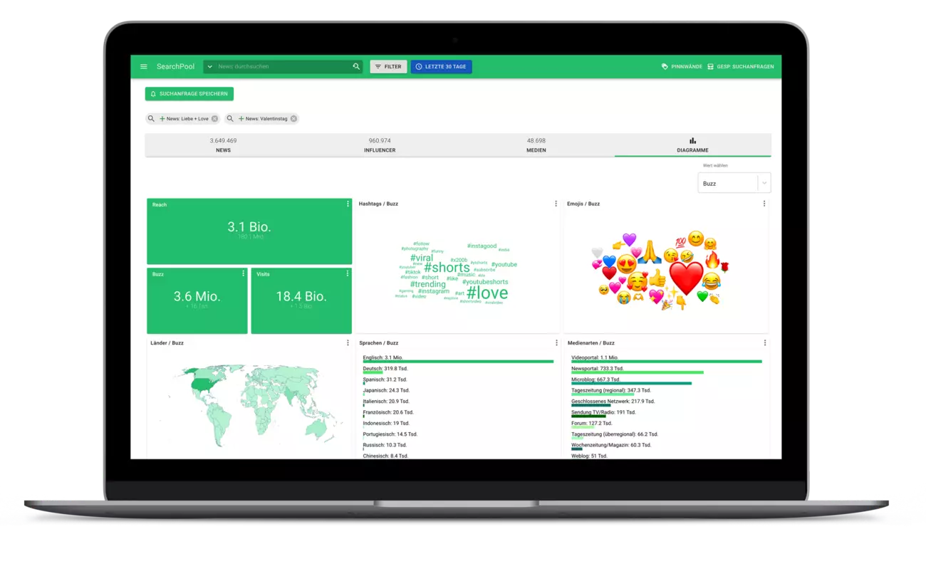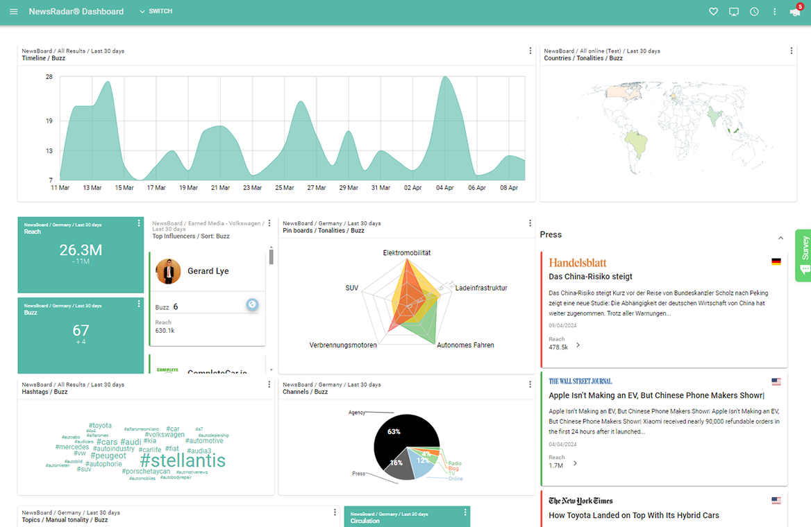 Als Beispiel für unser Engagement für Innovation, gewährleistet NewsRadar® eine erstklassige Usability und Zuverlässigkeit. NewsRadar® bietet einen umfassenden Überblick über medienübergreifende Beiträge, wobei Inhalte aus den klassischen Medien und den digitalen Medien nahtlos in ein zentrales, individuell anpassbares Analyse-Dashboard integriert werden. Dabei gibt es eine Vielzahl an Datenvisualisierungsoptionen.