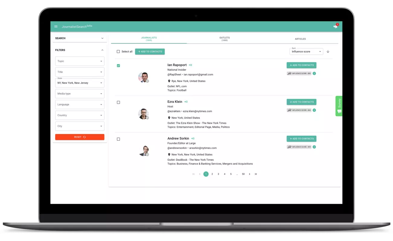 Mit ContactManagement können Benutzer Kontakte hinzufügen und sie für eine gezielte Ansprache in individuellen Verteilerlisten gruppieren. Um die richtige Zielgruppe zu finden, können Sie nach relevanten Kriterien wie Themen, Reichweite und Demografie filtern und die entsprechenden Ergebnisse zu Ihren Verteilerlisten hinzufügen. Sie können auch eigene Kontakte in das Tool importieren, wodurch Sie Zugang zu einer umfangreichen und erweiterten Datenbank von Medienkontakten und Influencern erhalten.