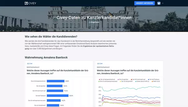 Zum anderen befragte Civey die Wählerinnen und Wähler repräsentativ, wie sie die KandidatInnen wahrnehmen. Das Ergebnis: Obwohl eine ausgewogene Berichterstattung in den Medien stattfindet, werden den KandidatInnen unterschiedlich stark Emotionen von den WählerInnen zugesprochen.