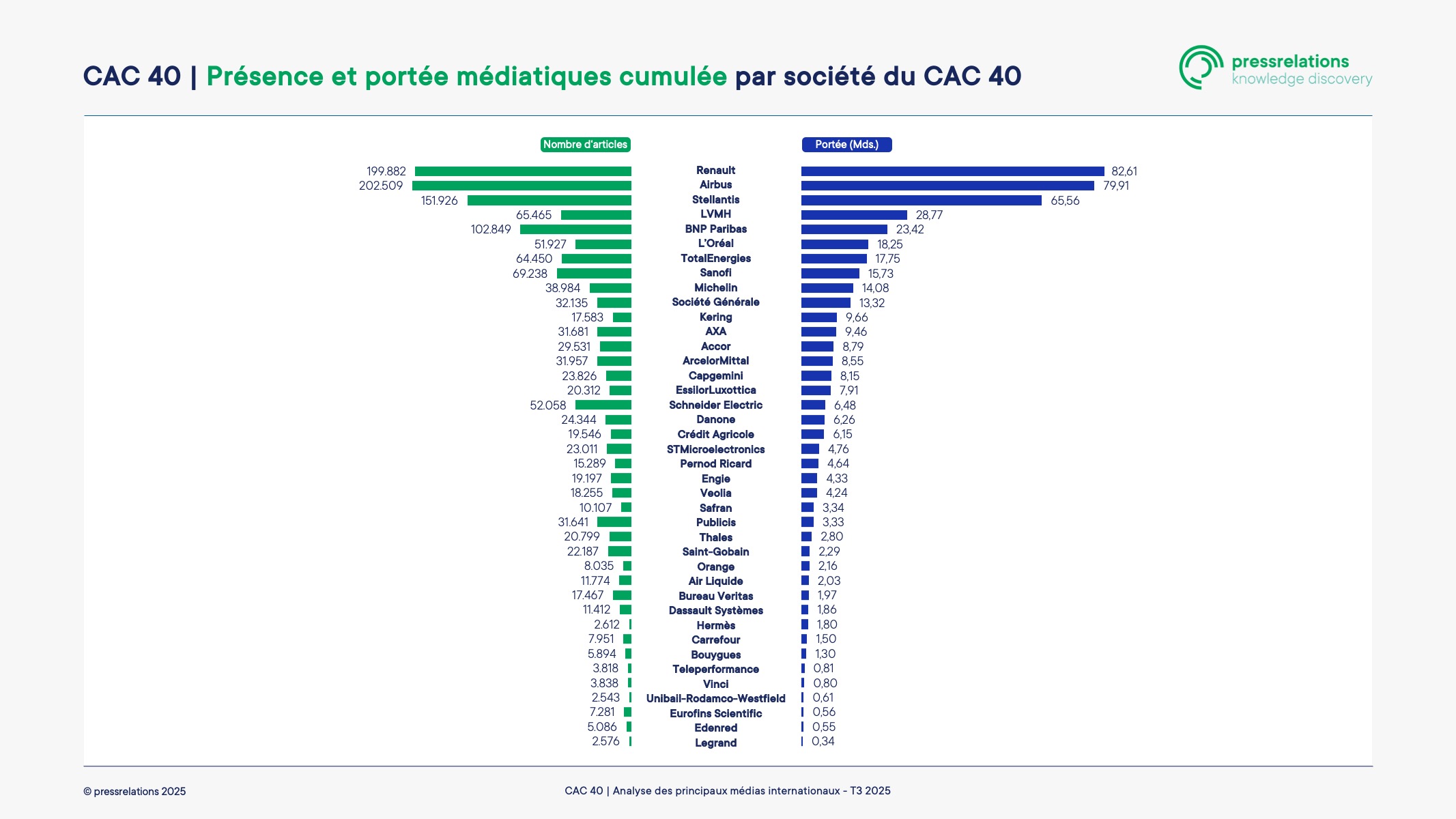 La société pressrelations, spécialisée dans la veille et l’analyse médiatique, a développé le premier observatoire du « softpower médiatique » des entreprises du CAC 40 à l’échelle mondiale. Après l’analyse de plus de 235 000 sources, de 193 pays, le classement distingue Renault, Airbus, Stellantis, LVMH et BNP Paribas dans le top 5 des sociétés les plus influentes dans l’espace médiatique pour le troisième trimestre 2025. Alors que la France traverse une crise politique d’envergure et cultive l’incertitude, il est notable de voir que l’indice globale de tonalité de l’influence médiatique des entreprises du CAC 40 est à un niveau de 3,4 sur 5 points, soit « plutôt positif ».